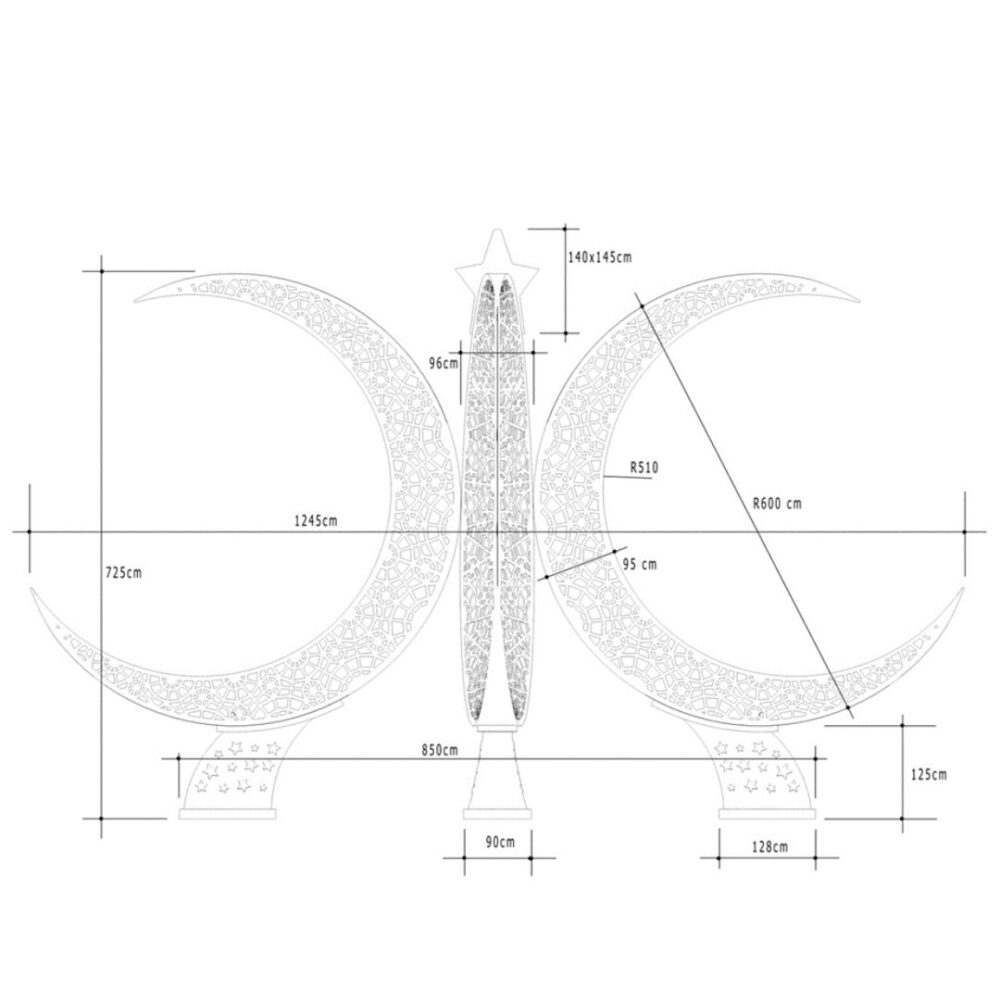 • Çelik konstrüksiyon zemin beton ankrajları verilen projeye göre idare tarafından yapılacaktır. KONSTRÜKSYON Hilaller ve yıldızın taşıyıcısı çelik konstrüksiyondur. Her hilal için 3 kenar için 100mm çap, 3mm kalınlığında borular ana taşıyı olarak, 50mm çapında ,3mm kalınlığında borularla bağlayıcı olarak kullanılacaktır.