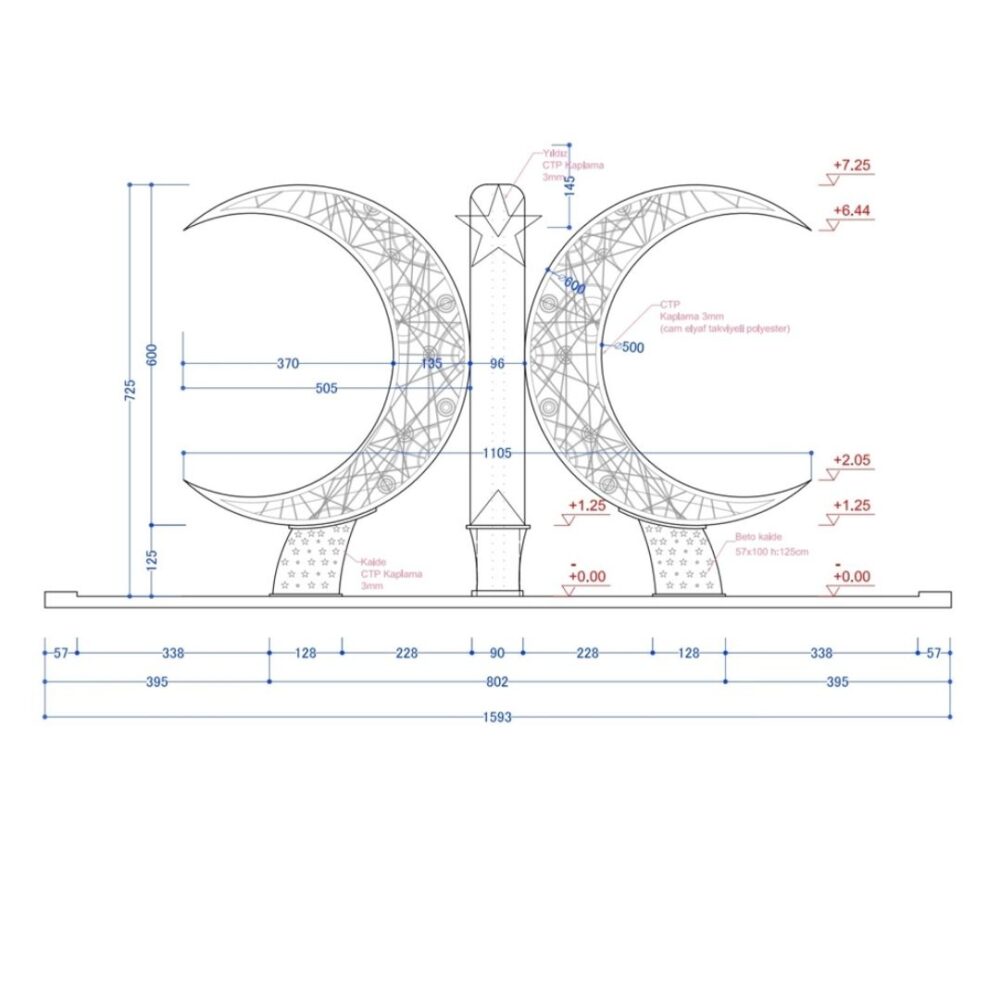 • TEMEL İdarenin yapacağı zemin beton üzerine bina edilecektir. HİLAL Hilallerin dış çapı 6m olup, iç çapları 5m dir. İç çapın merkezi dış çapın merkezine göre 95 cm sağa doğru kayıktır. Hilallerin en geniş yerinde oluşan üçgenin tabanı 96 cm dir. Motifin derinliği her bölgede 5cm olarak imal edilecektir. Hilallerin dış yüzeyi CTP olup konstrüksyon görülmeyecektir.